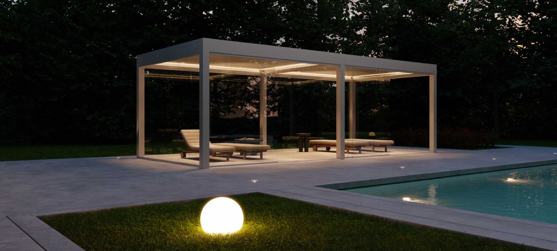 Sistema di copertura autoportante, dal design essenziale. Idonea a trasformare ampi spazi esterni in aree abitabili.
