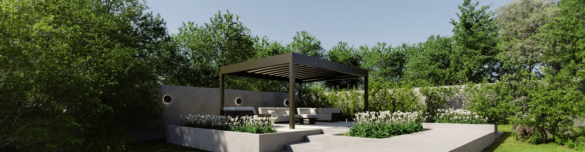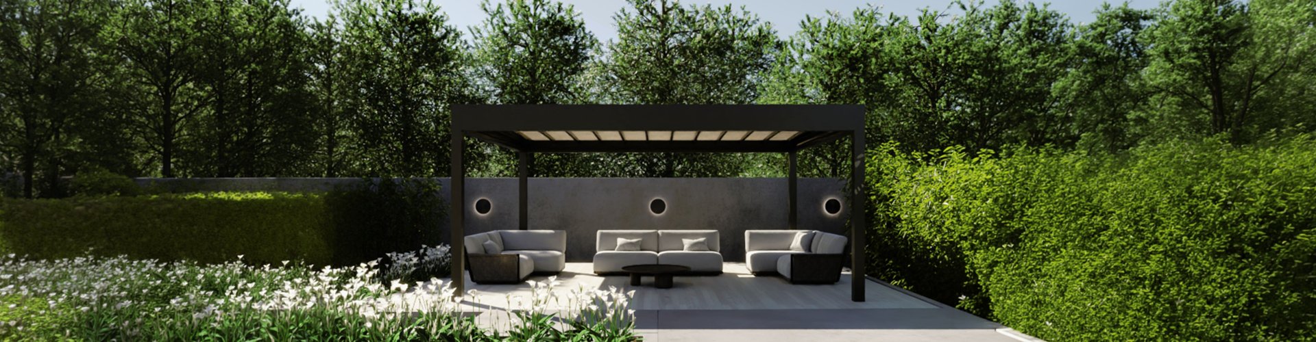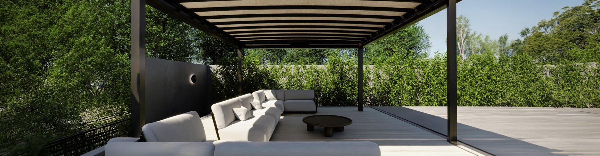 TABULA è una pergola piana, con archi centinati scorrevoli su guide nascosti alla vista esterna da un fascione perimetrale. Le gronde perimetrali di notevoli dimensioni consentono la raccolta delle acque e l’espluvio tramite i piantoni.